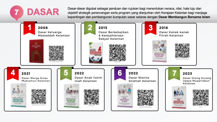 Berasaskan dasar MBI, urus setia di bawah portfolio Kebajikan,Pembangunan Keluarga dan Wanita telah menghasilkan dasar-dasar berkaitan secara tuntas iaitu; Dasar Keluarga Mawaddah Kelantan (2008), Dasar Kebajikan dan Kesejahteraan Rakyat Kelantan (2015), Dasar Kanak-Kanak Fitrah Kelantan (2018), Dasar Warga Emas Mukramun (2021), Dasar Anak Yatim Islah Kelantan (2022), Dasar Wanita Solehah Kelantan (2022) dan Dasar OKU Muqarrabun Kelantan (2023).